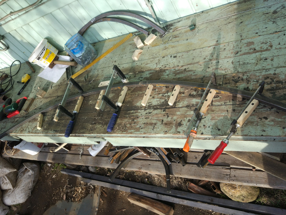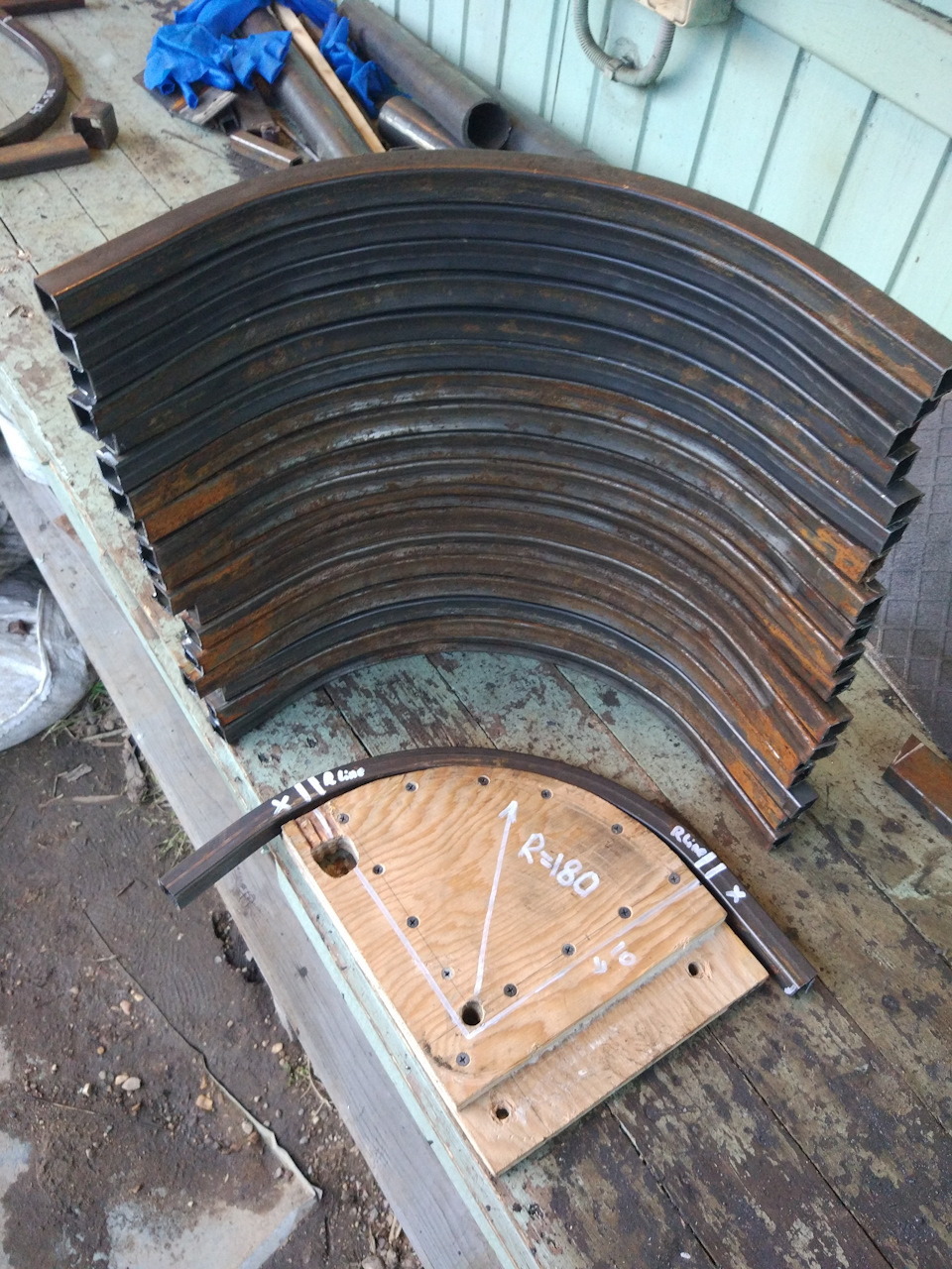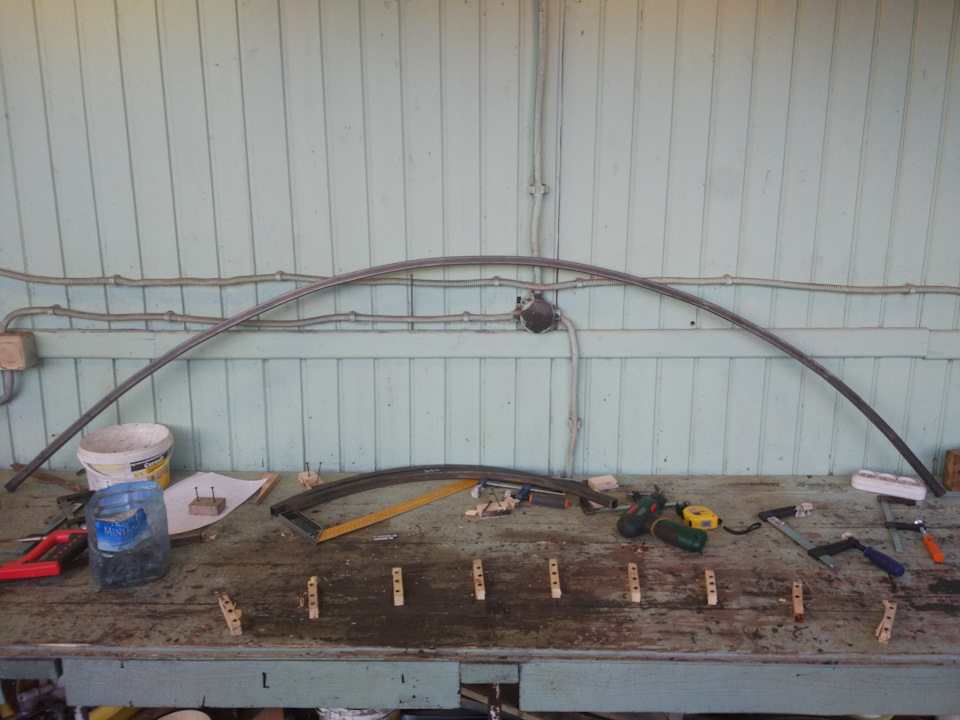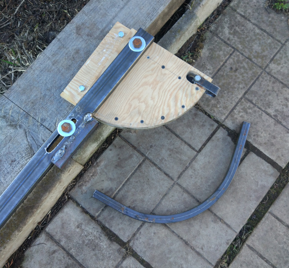 В конструкции немало гнутого профиля с 4 разными радиусами: 180, 380, 1400, 1600 мм. Для первых двух делаю простейший трубогиб из фанеры и профильной трубы.