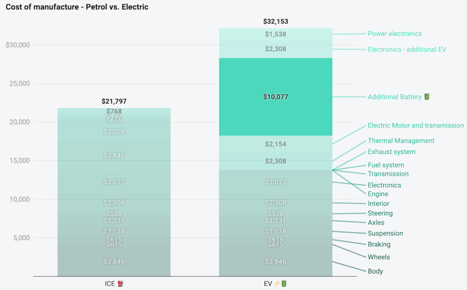 Высоковольтные батареи составляют значительную часть стоимости производства электромобилей из-за трудоемкой добычи необходимых минералов, что приводит к более высоким первоначальным затратам по сравнению с бензиновыми аналогами. В среднем батареи составляют около трети общих производственных затрат (график ниже), но эта доля увеличивается по мере роста емкости батарей.