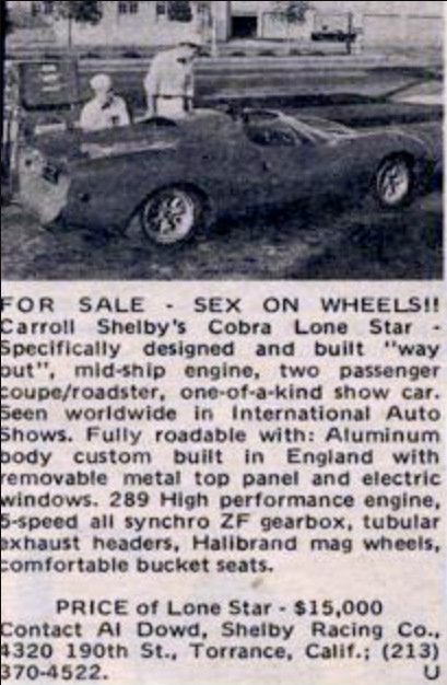Из единственного собранного Lone Star постарались выжать всю пользу. Его демонстрировали на американских автосалонах 1968 года в качестве концепт-кара, а фотография Lone Star на обложке привлекала внимание к каталогу Shelby Accessories. А к концу сезона его выставили на продажу. Разместив объявление все в том же журнале AutoWeek в октябре 1968 года, Shelby American предлагали потенциальным клиентам впечатляющий внешне и уникальный во всех смыслах автомобиль под слоганом "Продается секс на колесах" за те самые $15000. Очереди из желающих не было, хотя в какой-то момент машину все же продали. В следующие годы она сменила нескольких владельцев и успела даже побывать на площадке обычного дилера подержанных автомобилей, пока в 1975 году ее не приобрел энтузиаст Cobra Майкл Шоэн.