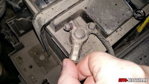 Важно! Необходимо строго соблюдать следующую последовательность снятия клемм. Сначала надо ослабить затяжку минусовой клеммы, снять её, отвести в сторону и зафиксировать в снятом положении и только после этого снять плюс.