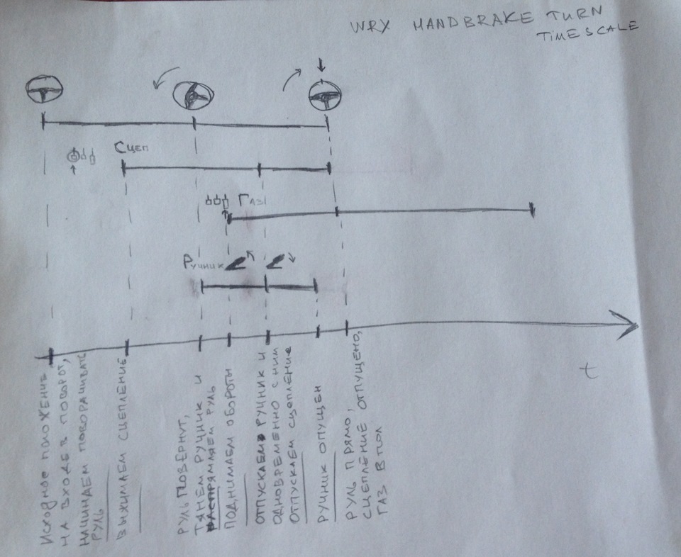 Поскольку поворот на ручнике на полном приводе — это те еще пляски с бубном, мы начали с отработки правильной последовательности действий и синхронизации всех конечностей. Пришлось даже немного порисовать: