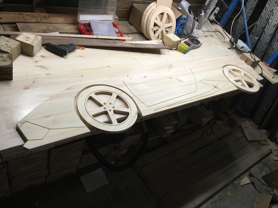 Самое интересное, что в проекте не использовались дорогостоящие пиломатериалы, а только то, что оказалось под рукой: старые доски с изъеденными и полуразрушенными краями, которые наверняка где-то уже использовались. Подобрав куски нужного размера, мастер их разметил и вырезал из них отдельные «кузовные панели». Их он потом закрепил на пространственном каркасе и соединил при помощи клея. После обрезки и полировки кузов принял почти завершённый вид, а последним штрихом стало покрытие лаком. После этого масштабная модель приобрела настолько интересный внешний вид, что в неё захотели втиснуться взрослые.
