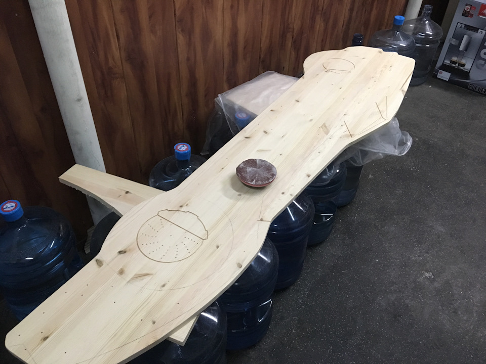 Далее, от руки, перенес эскиз на щит 2000*40*18. Главное соблюсти основные параметры внешних габаритов (длина, высота), остальное можно на глаз. ВАЖНО! Если работаете ручным фрезером (как в моем случае), то все декоративные линии лучше делать до выпиливания контура. После будет неудобно, так как площадка фрезера должна "ходить по плоскости"!