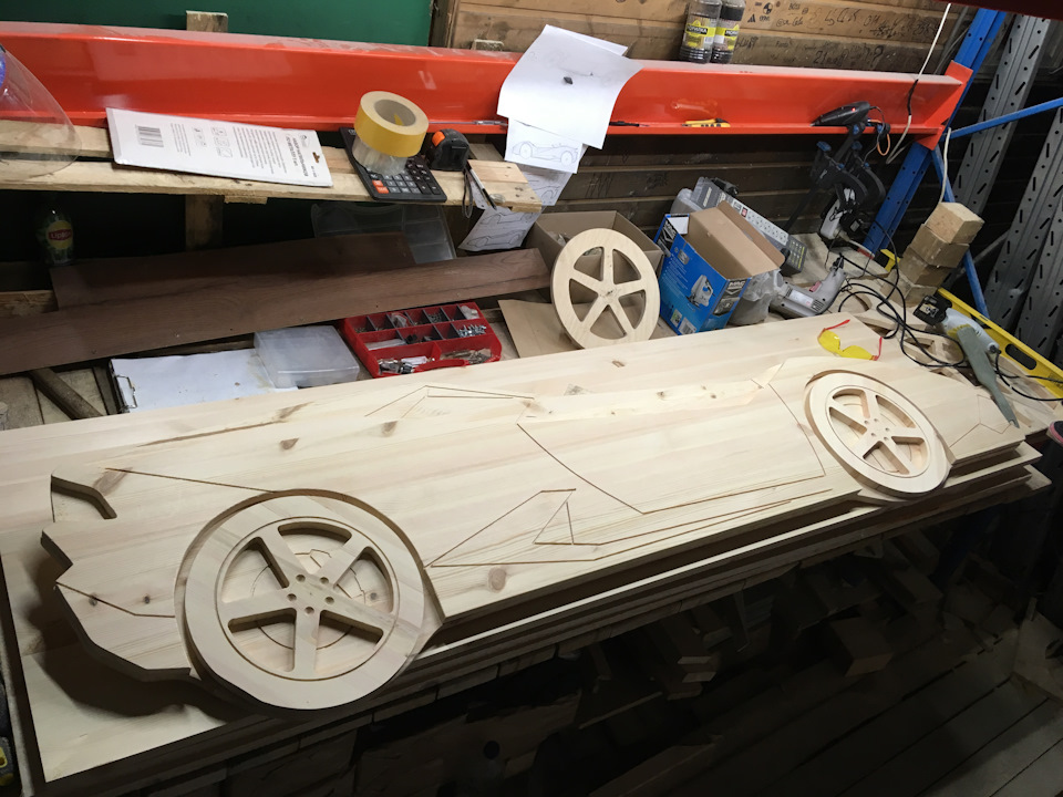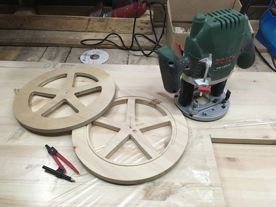 Начал с колес, первое получилось очень корявым (на фото оно в центре). Затем сделал шаблон из фанеры, обработал его напильником и наждачкой и по нему уже скопировал фрезером все четыре колеса