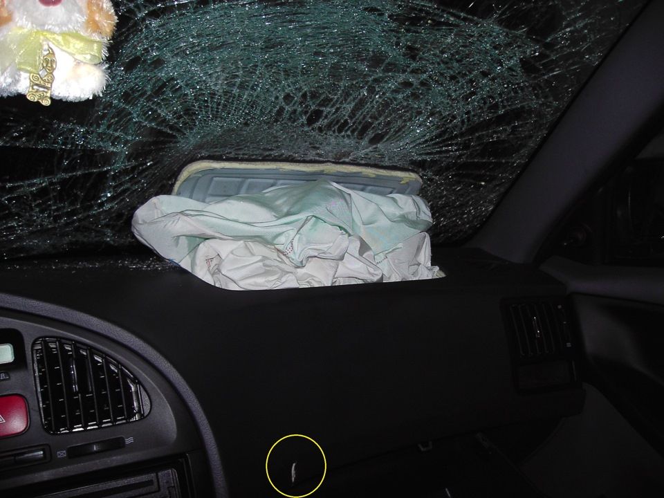 Косвенным подтверждением того, что в машине срабатывала передняя подушка безопасности, может стать неродное лобовое стекло. Дело в том, что у некоторых моделей при срабатывании подушки (как правило, переднего пассажира) часть торпедо над отсеком аэрбега, отлетая, разбивает стекло.
