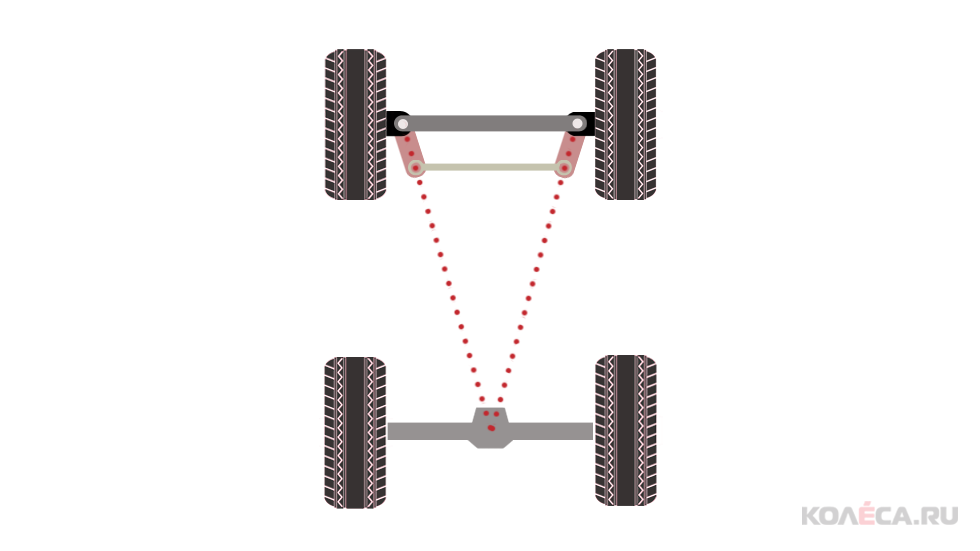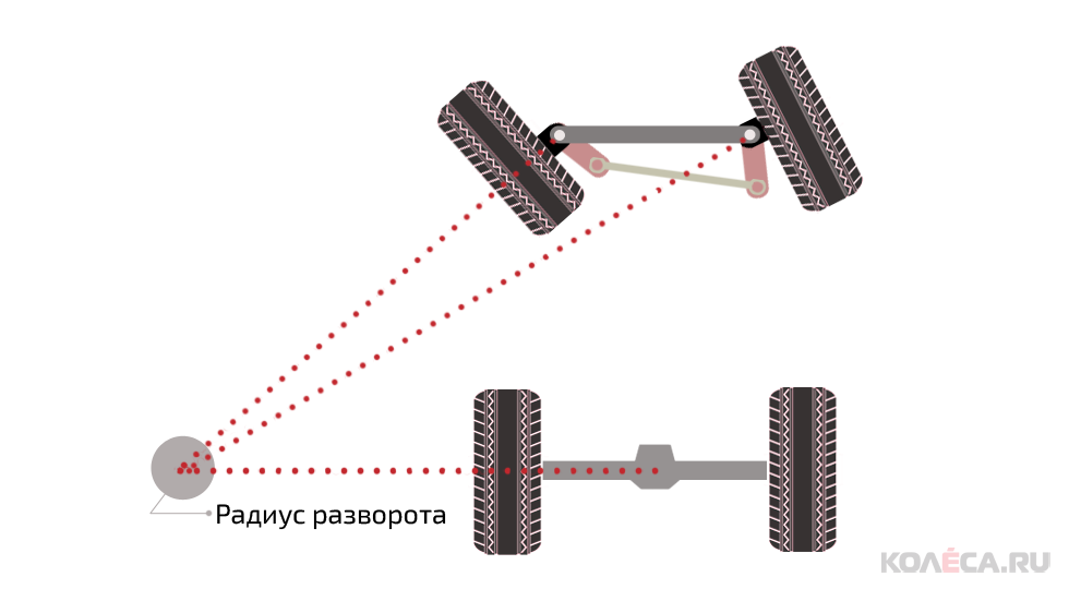 Соответственно, при повороте колес в такой схеме они оказываются повернуты на разные углы – внутреннее поворачивается больше, а наружное меньше. При этом центры окружностей, по которым движутся колеса, совпадают, а радиус окружности для наружного колеса — это фактически радиус разворота автомобиля «от бордюра до бордюра» с поправкой на ширину шины.